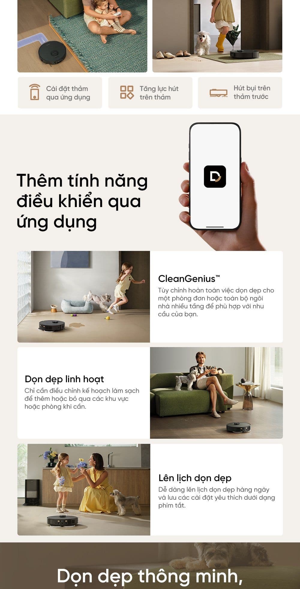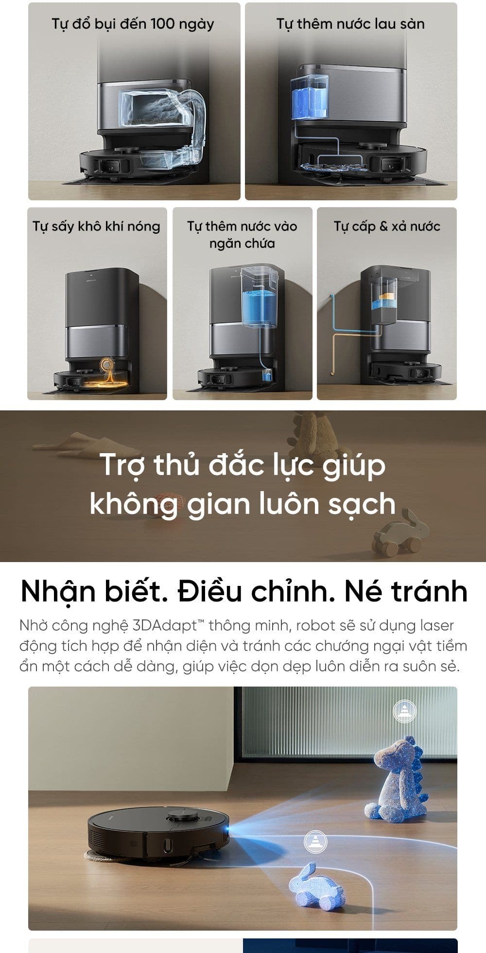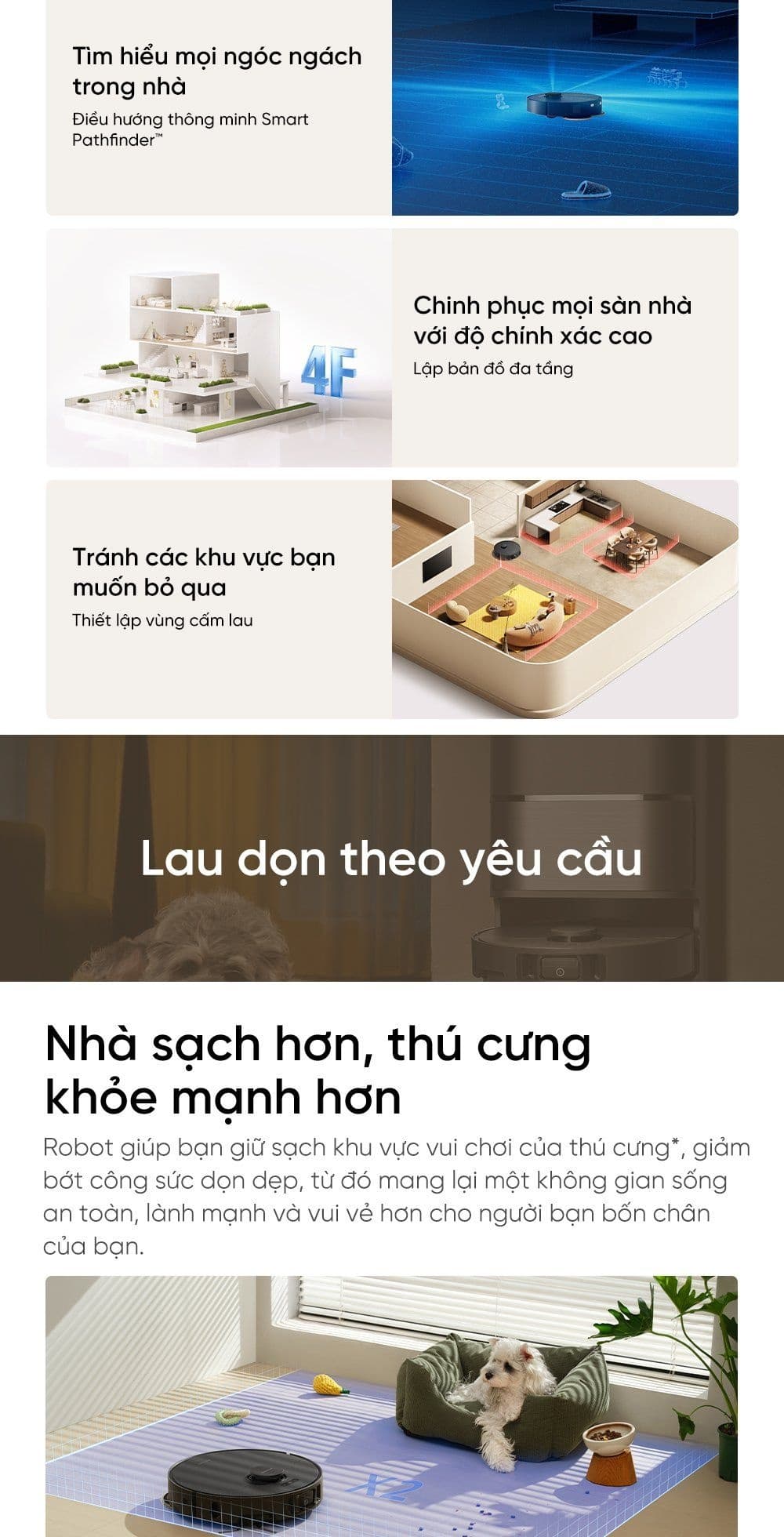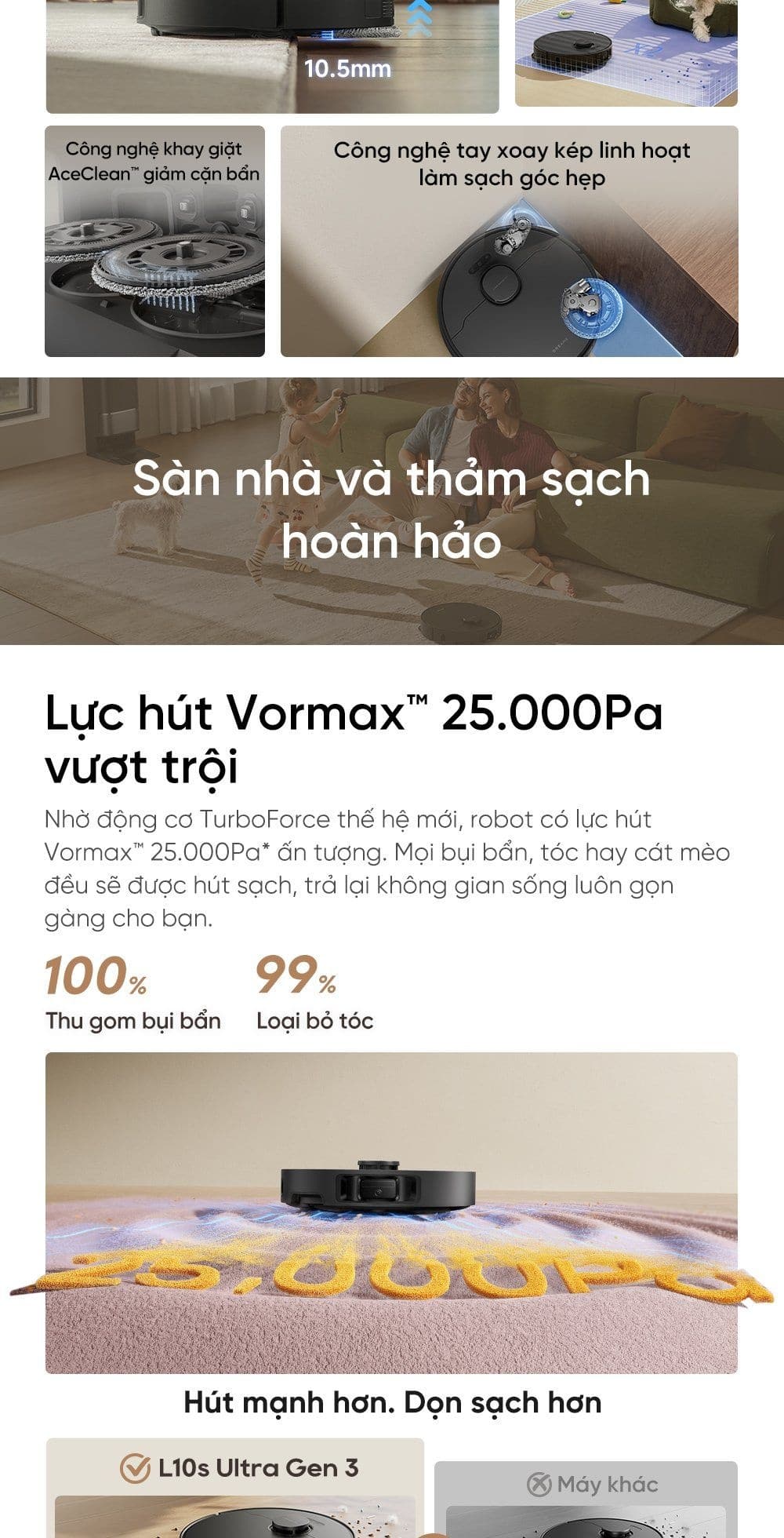 • Lực hút Vormax™ 25.000Pa vượt trội: Hút Sạch Triệt Để: Được trang bị động cơ Vormax™ thế hệ mới, robot đạt lực hút mạnh mẽ lên đến 25.000Pa – dễ dàng hút sạch mọi loại bụi bẩn cứng đầu, bụi mịn, lông thú cưng, tóc rối và mảnh vụn lớn chỉ trong một lần di chuyển.
