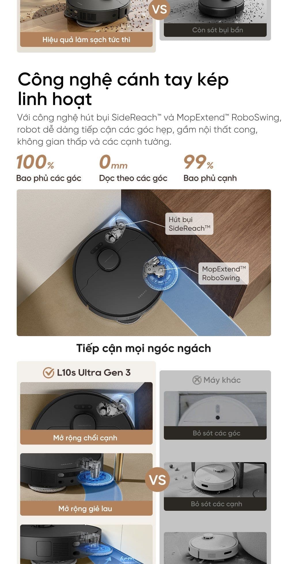 • Công nghệ cánh tay kép linh hoạt: Cánh Tay Robot Linh Hoạt: Đây là tính năng đột phá của Dreame. Robot có khả năng vươn giẻ lau ra ngoài thân máy (MopExtend™ và SideReach™) để chạm sát mép tường và góc khuất. Đây là giải pháp hoàn hảo để xử lý các khu vực mà robot thông thường thường bỏ sót
