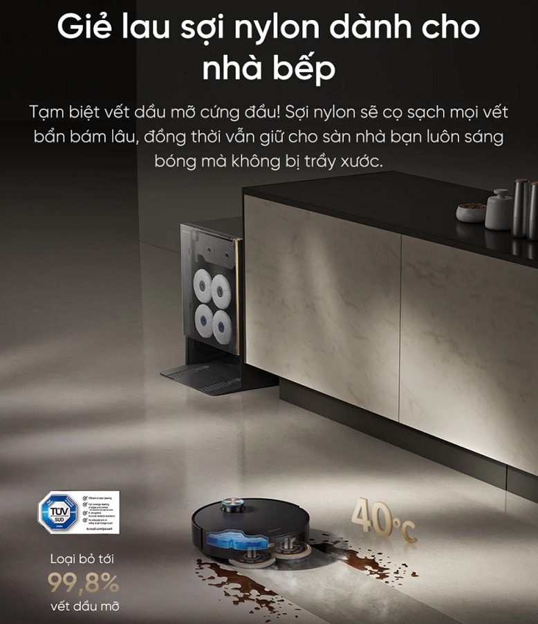 Giặt Giẻ Nước Nóng 100°C (ThermoHub™): Sử dụng nước siêu nóng để giặt sạch giẻ, diệt khuẩn 99.9% và loại bỏ hoàn toàn dầu mỡ, ngăn ngừa mùi hôi và ẩm mốc.