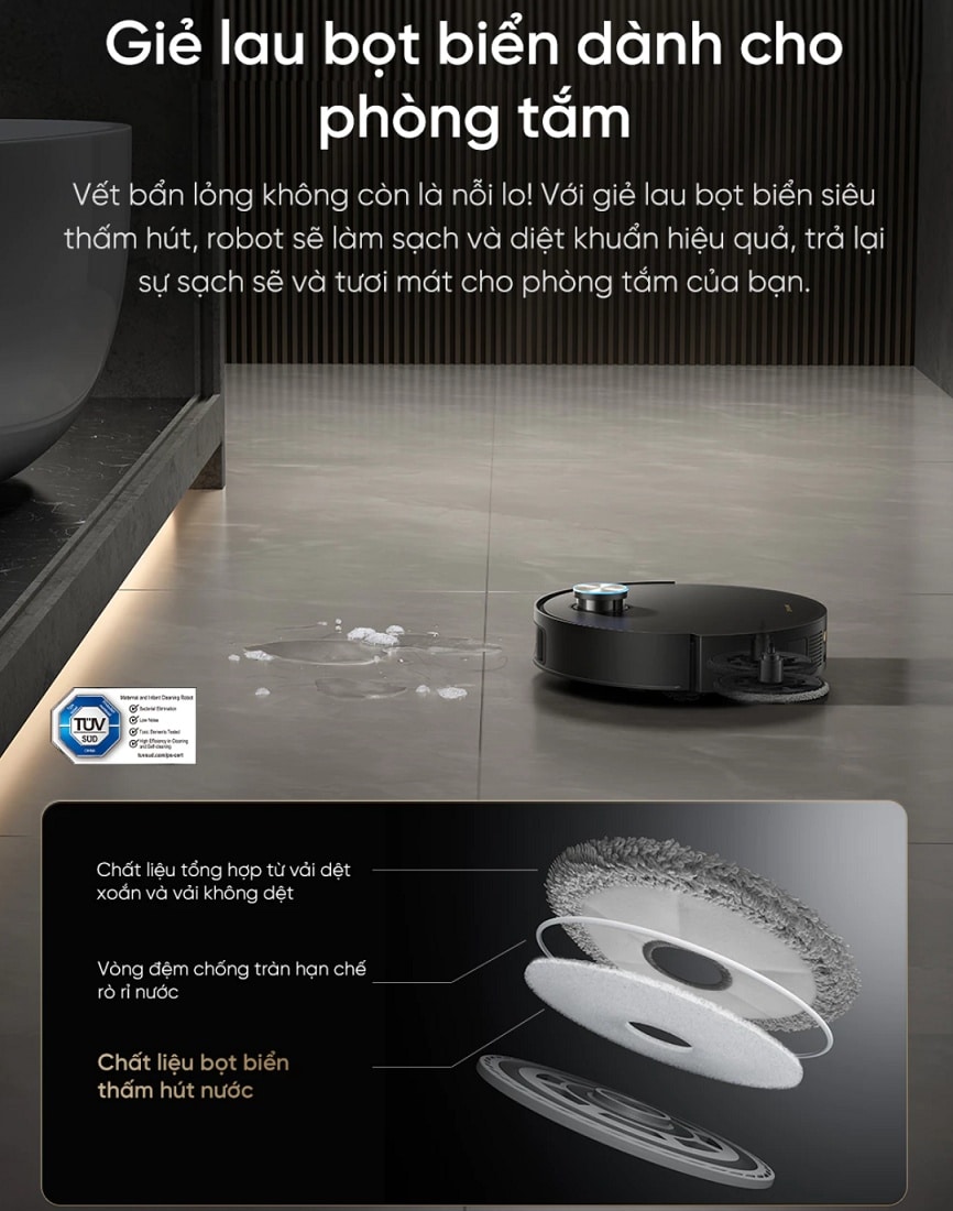 Tự Động Thay Giẻ Lau Theo Khu Vực: Trạm sạc chứa nhiều bộ giẻ lau chuyên biệt và tự động thay giẻ khi robot di chuyển giữa các phòng (ví dụ: bếp, phòng tắm, phòng khách).