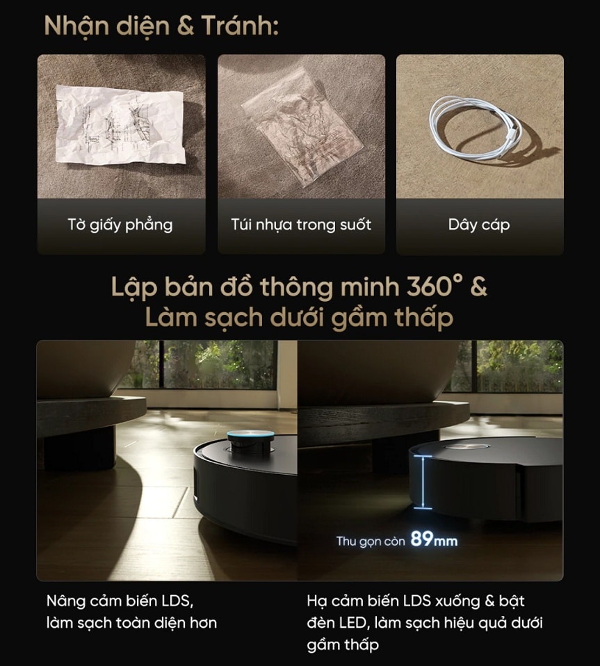 AI Nhận Diện 240+ Vật Thể: Sử dụng ánh sáng cấu trúc 3D và thuật toán AI để nhận diện và tránh hơn 240 loại vật thể, bao gồm dây điện, tất, đồ chơi nhỏ, và phân thú cưng.