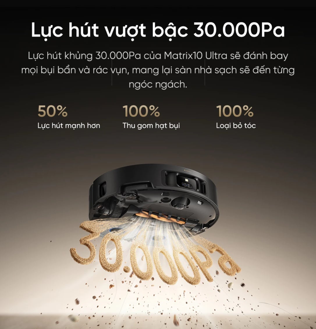 - Sức Mạnh Vượt Trội: Matrix10 Ultra sở hữu lực hút Vormax™ Suction lên đến 30.000Pa – mức mạnh nhất trên thị trường hiện nay. Sức mạnh này đảm bảo hút sạch mọi loại bụi bẩn từ bụi mịn, phấn hoa cho đến các mảnh vụn lớn và cát mèo, kể cả trong các rãnh sàn sâu và thảm dày.