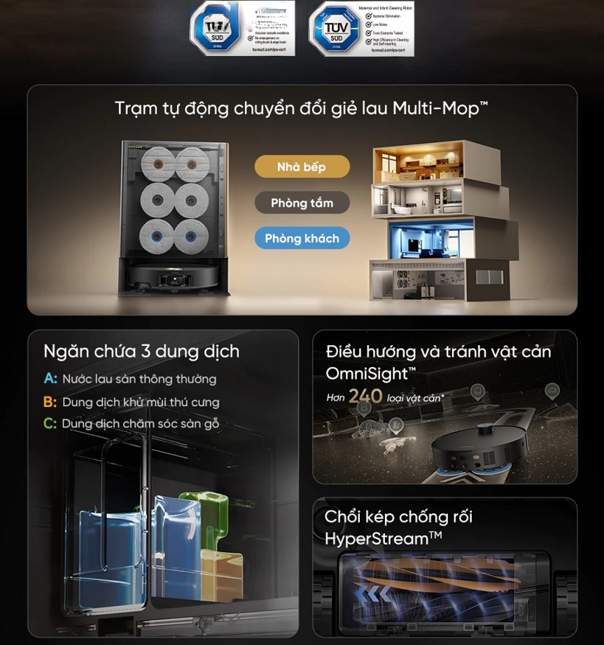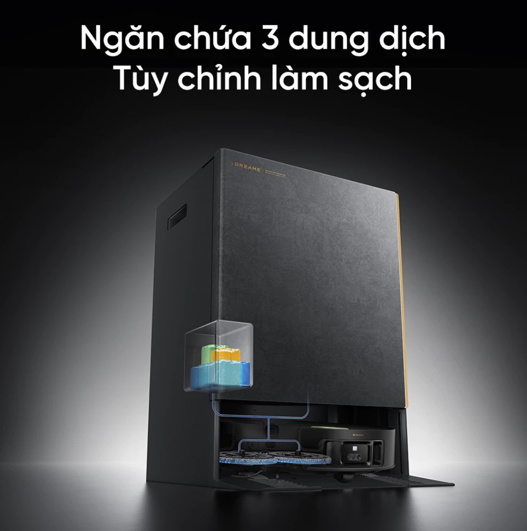 Hệ Thống 3 Ngăn Dung Dịch: Robot tích hợp 3 ngăn chứa dung dịch vệ sinh chuyên biệt: Khử mùi thú cưng, Chăm sóc sàn gỗ, và Lau đa năng, cho phép tùy chỉnh hóa chất theo từng khu vực.