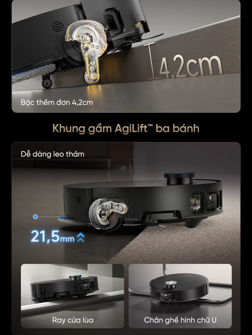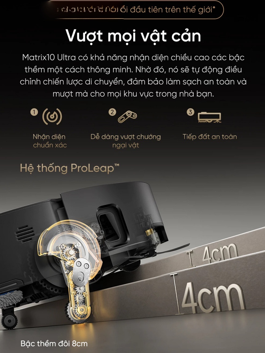 Vượt Chướng Ngại Vật ProLeap™ 8cm: Với khả năng nâng hạ khung gầm linh hoạt (Triple-Wheel AgiLift™ Chassis), Matrix10 Ultra có thể leo qua các bậc thềm và gờ cửa cao tới 8cm, đảm bảo không bị kẹt hay gián đoạn.