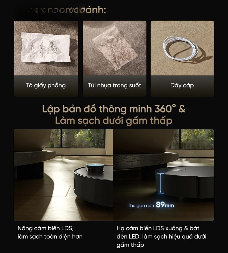 Đổ Bụi Tự Động: Túi chứa bụi 3.2L cho phép robot tự động đổ rác, người dùng chỉ cần thay túi sau 100 ngày.