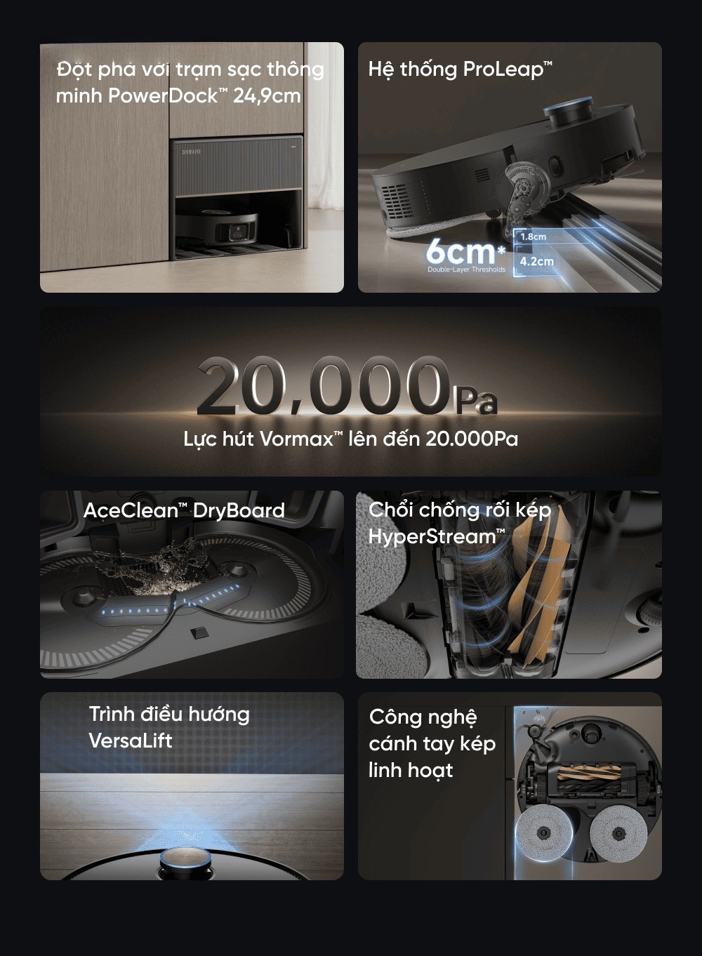 • Lực hút Vormax™ mạnh mẽ: X50 Master được trang bị động cơ TurboForce thế hệ thứ sáu với tốc độ quay lên đến 90.000 vòng/phút, tạo ra lực hút Vormax™ 20.000Pa. Robot có khả năng loại bỏ mọi mảnh vụn, từ bụi bẩn nhỏ nhất đến tóc và cát vệ sinh cho thú cưng.