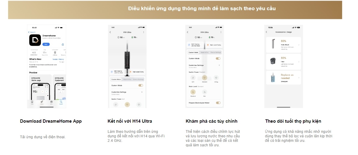 - Điều khiển qua App Dreamehome: Ứng dụng Dreamehome cho phép bạn điều khiển máy từ xa, lên lịch dọn dẹp, theo dõi tình trạng máy và nhận các thông báo hữu ích.
