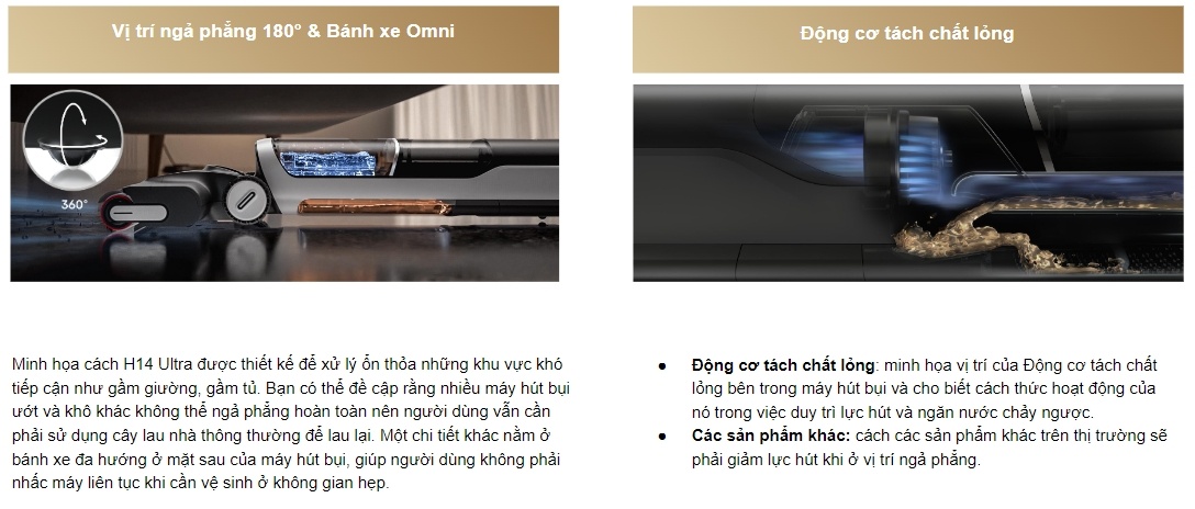 - Động cơ phân tách chất lỏng: Công nghệ tiên tiến này giúp H14 Ultra hoạt động hiệu quả trên cả bề mặt khô và ướt. Động cơ tách riêng chất lỏng và chất rắn, ngăn chặn tình trạng tắc nghẽn và đảm bảo lực hút luôn ổn định.