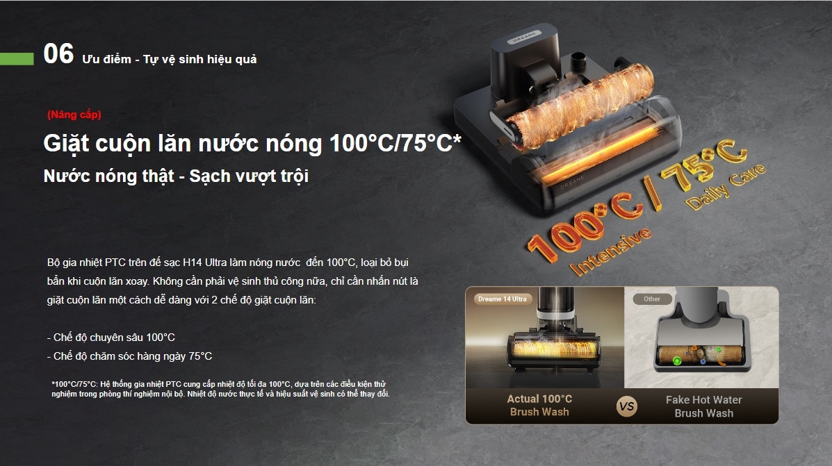 - Giặt cuộn lăn nước nóng 100°C/75°C: Tính năng này giúp loại bỏ hiệu quả vi khuẩn và các vết bẩn cứng đầu trên cuộn lăn, đảm bảo vệ sinh tối đa.